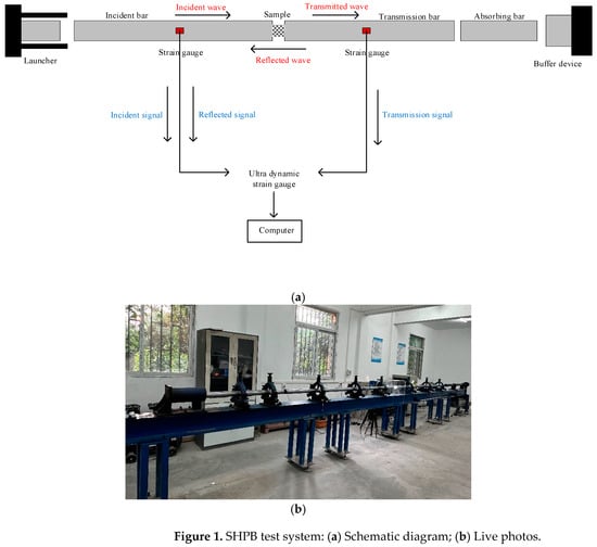 Figure 1. SHPB test system: (a) Schematic diagram; (b) Live photos.