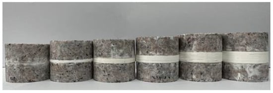 Each type of jointed rock sample was produced in triplicate to ensure the consistency required for parallel experiments. In accordance with the fundamental requirements of the “Rock Dynamic Properties Testing Code” [22], it was ensured that both end surfaces were smooth, with parallelism and perpendicularity controlled within the range of 0.01 to 0.02 mm. Considering the impact of errors during the experimental process and to ensure the credibility of the experimental data, each type of rock sample underwent three replicate tests. The prepared jointed rock samples are shown in Figure 3, and the physical parameters of different types of rock samples are presented in Table 2.