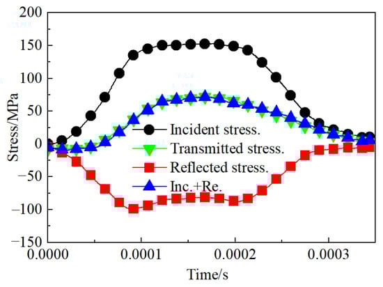 Based on the one-dimensional stress wave theory, during the SHPB impact test, the stress at both ends of the rock sample must reach an equilibrium state before failure. Figure 4 illustrates the stress equilibrium at both ends of the jointed rock specimen. The reflected stress propagates in the opposite direction to the incident stress; hence its signal value is negative. Consequently, the stress at the incident end (the sum of the incident stress and the reflected stress) is essentially consistent with the transmitted stress. The stresses at both ends of the rock sample satisfy the equilibrium condition, namely σ1(t) = σ2(t), indicating that the sample is in a state of dynamic stress equilibrium during the impact test, ensuring the validity of the experimental data.