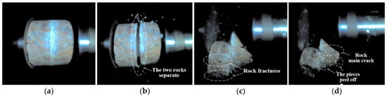 Figure 7. Dynamic failure process of a 2.40 mm filled jointed rock sample: (a) Preimpact; (b) 5.445 ms; (c) 49.002 ms; (d) 59.891 ms.