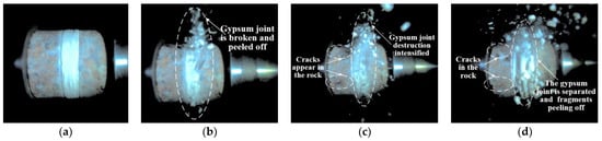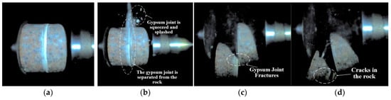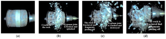 Figure 10. Dynamic failure process of 10.73 mm filled jointed rock sample: (a) Preimpact; (b) 5.445 ms; (c) 21.779 ms; (d) 43.557 ms.
