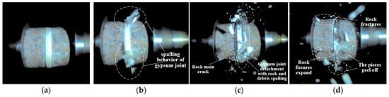 Figure 8. Dynamic failure process of a 4.91 mm filled jointed rock sample: (a) Preimpact; (b) 0.907 ms; (c) 9.982 ms; (d) 66.243 ms.