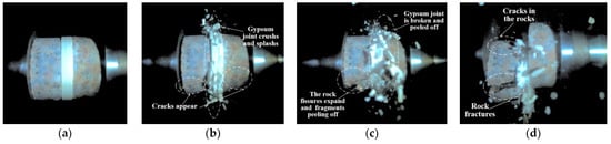 Figure 11. Dynamic failure process of 12.15 mm filled jointed rock sample: (a) Preimpact; (b) 4.537 ms; (c) 14.519 ms; (d) 79.855 ms.