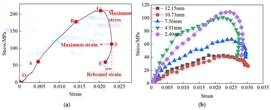 Figure 12. Stress–strain curves of jointed rock samples: (a) Unfilled jointed rock sample; (b) Filling type jointed rock sample.