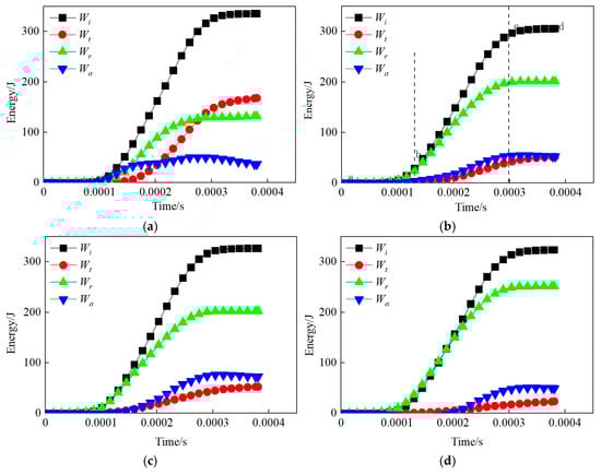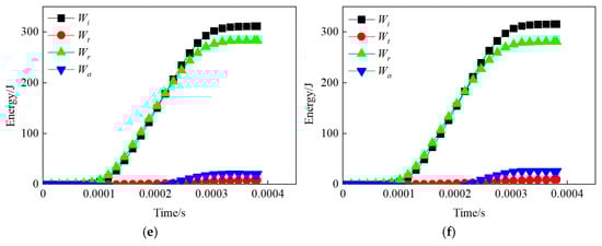 Figure 14. Energy time history curve: (a) Unfilled; (b) 2.40 mm; (c) 4.91 mm; (d) 7.56 mm; (e) 10.73 mm; (f) 12.15 mm.