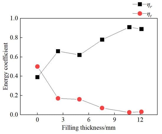 The relationship between the energy reflection coefficient, ƞr, energy transmission coefficient, ƞt, and filling thickness is depicted in Figure 15. The ƞr and ƞt of jointed rock samples with filling thicknesses of 2.40 mm, 4.91 mm, 7.56 mm, 10.73 mm, and 12.15 mm are 39.12%, 66.05%, 62.13%, 78.56%, 91.23% and 50.22%, 17.08%, 16.35%, 7.22%, 2.50%, respectively. As the filling thickness increases, the energy reflection coefficient shows a linearly increasing trend, while the energy transmission coefficient exhibits a linearly decreasing trend.