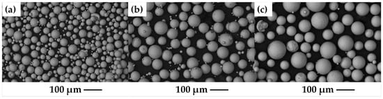 Initial powders Ti6Al4V, (a) 20–45 µm, (b) 45–75 µm and (c) 75–106 µm.
