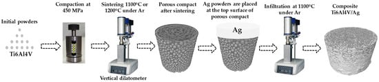 This work investigates the fabrication of Ti6Al4V composites manufactured by powder metallurgy through pressureless infiltration. Porous Ti6Al4V alloy compacts with different particle sizes were fabricated by sintering and then, liquid Ag was infiltrated to obtain composites. Computed microtomography was used to analyze the samples before and after infiltration. Numerical flow simulations and dilatometry tests evaluated the kinetics of Ag infiltration into porous Ti6Al4V compacts. Microstructure was observed by SEM and mechanical strength was evaluated by compression tests. Results showed that the pore properties play a crucial role in the infiltration timing and the distribution of the Ag’s liquid. In particular, large pores allowed the infiltration to start a few °C degrees earlier than samples with smaller pores. Three-dimensional images after infiltration showed that most of the pores were filled and the remaining ones were isolated. The resulting microstructure was composed of Ti2Ag, α-Ti and Ag phases, indicating that the Ag diffusion occurred. Furthermore, the mechanical strength depends on the interparticle neck sizes and the Ag improves the plastic deformation reached during compression tests. The best results were obtained for the samples with larger pore sizes because the resulting mechanical properties (E = 23 GPa and σy = 403 MPa) are close to that of human bones, making it the best candidate as an antibacterial material for biomedical use.