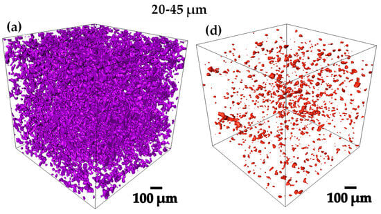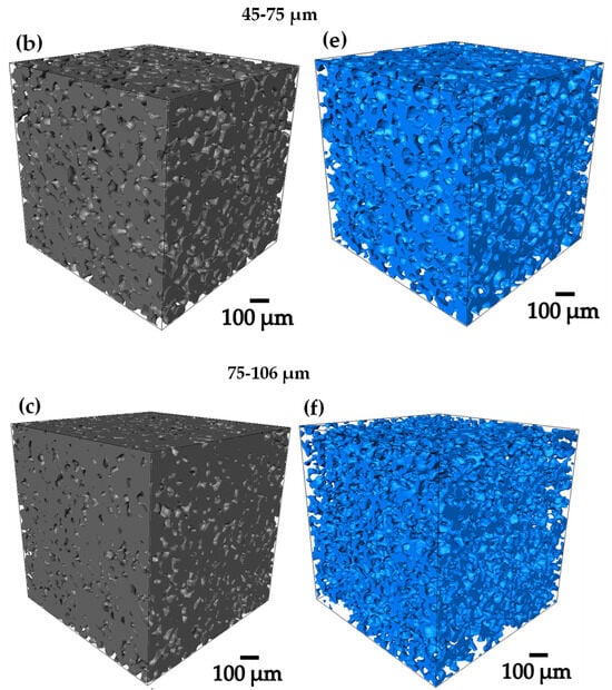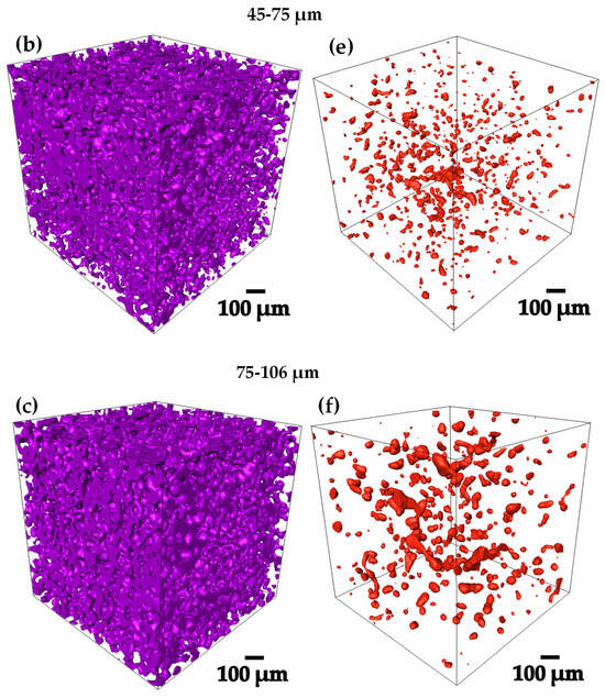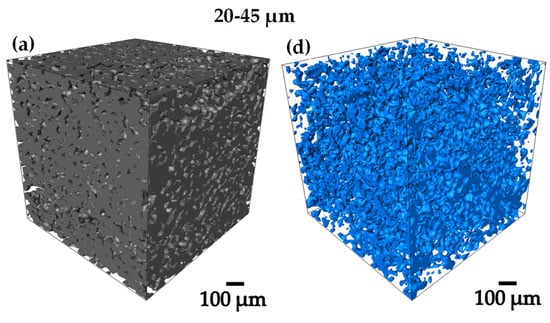 From 3D images of gray level acquired by computed microtomography, binary images were obtained by thresholding, in order to be able to work on the whole 3D image analysis [32,33]. Figure 4a–f, shows the 3D renderings of the pre-sintered compacts, in where the Ti6Al4V and the porosity can be qualitatively observed [34]. The 75–106 µm compact was the one that presented the highest volume fraction of pores with 29.6% as shown in Table 1, denoting the previously mentioned. All the compacts presented a pore volume fraction between 15 and 30 Figure 4a–f, obtaining different levels of densification to perform the infiltration of the Ag.