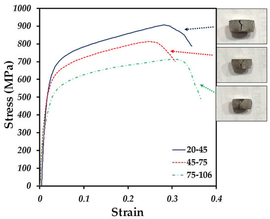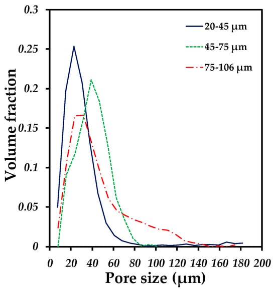 The segmented images were used to obtain the pore size distribution and the image analysis was performed in which the data obtained in the images were converted into tangible numerical data and interpreted in granulometry curves, shown in Figure 5. It can be seen that each compact has a different pore size distribution, which implies that the particle size used to fabricate the compacts directly influences the formation of pores, since they all followed low-temperature sintering conditions for each particle size used. The compact that presented a higher volume fraction with respect to the large pore size was the 75–106 µm compact, having pores with a size greater than 100 µm, while the 20–45 µm compact presented a higher number of pores with small sizes, from 15 µm to 40 µm. However, all the compacts showed the pattern of presenting the highest volume fraction with pore sizes from 20 µm to 60 µm. In a previous study, densification was linked to pore size as a function of the particle size used and attributed to sintering time and temperature [35].