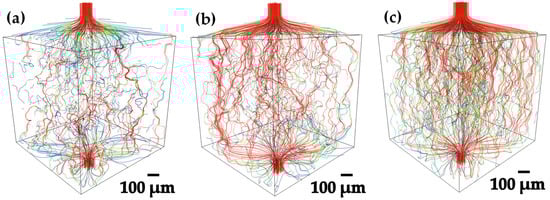 3D volume rendering of permeability simulations for the flow of Ag through the pores of Ti6Al4V compacts: (a) 20–45 µm, (b) 45–75 µm and (c) 75–106 µm.