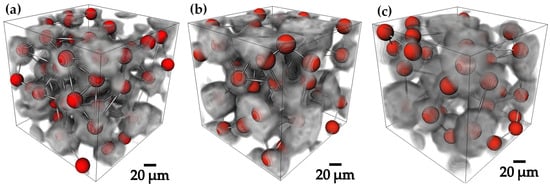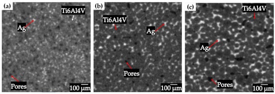 Ag infiltration was performed on Ti6Al4V compacts and 3D images of the infiltrated compacts were acquired by microtomography, as shown in Figure 9a–c. The difference in densities is reflected in the colors recorded in the images, the Ti6Al4V particles are recorded in dark gray, while the infiltrated Ag was recorded in light gray and the remaining pores are completely black. It is found that the infiltration process reached to fill most of the interconnected pores and leaving empty the remaining pores, since being completely isolated, they are not reached by the Ag and are completely empty. The image analysis process followed the same processing route that was used for the images of the pre-sintered compacts, the difference was in the Ag phase and how the images were processed with this new variable.