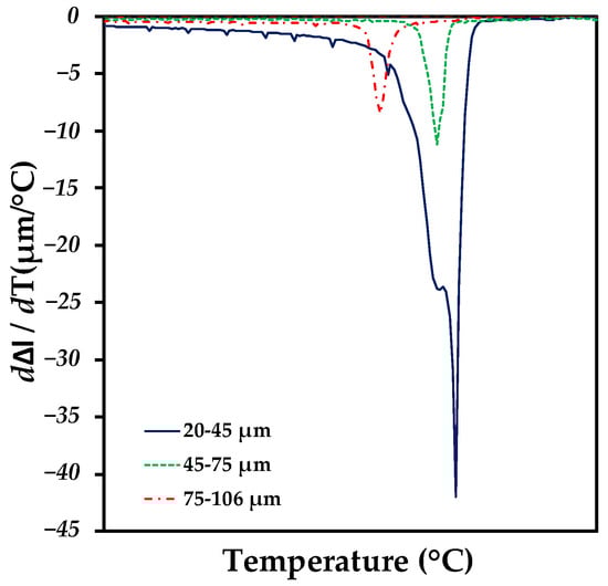 The displacement was directly plotted as a function of temperature, allowing us to know the exact temperature point at which the Ag infiltrates in each compact and the range in which the Ag infiltrates completely in all the pores. Figure 8 shows the dilatometry curves for each compact where the infiltration range for all the compacts is affected between 950 °C and 970 °C. The melting of the Ag is reflected immediately upon reaching its theoretical melting point at 950 °C. However, the displacement is still affected as a function of the temperature increase, since the equipment takes the parameters of how the porosity of the compact is being filled by the Ag. All the compacts infiltrated at different temperature ranges; the compact that infiltrated first was the 75–106 µm compact, having its critical infiltration point at 953.6 °C (this is understood as the Ag occupied all the available empty spaces). Nonetheless, the displacement activity started from 950 °C—this completely governed as a function of the porosity and tortuosity generated.