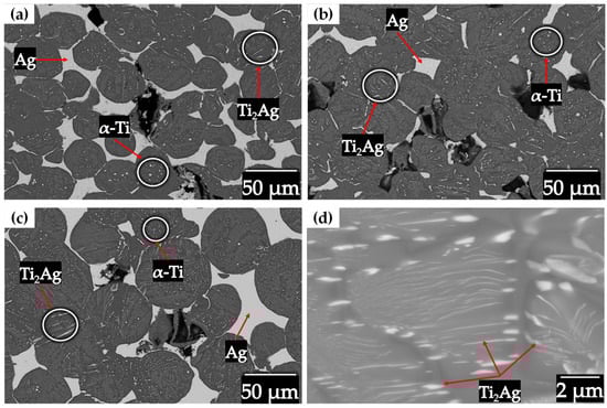Backscattered electron image of the Ti6Al4V/xAg compacts: (a) 20–45 µm, (b) 45–75 µm, (c) 75–106 µm and (d) Ti2Ag lamellae inside of Ti6Al4V particles.