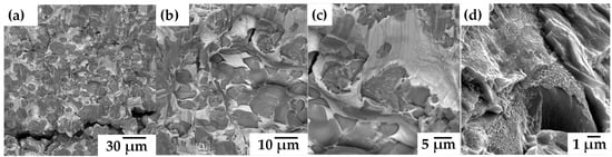 SEM images of fractured samples after compression tests at different magnifications; (a) 1000×, (b) 3000×, (c) 5000× and (d) 20,000×.