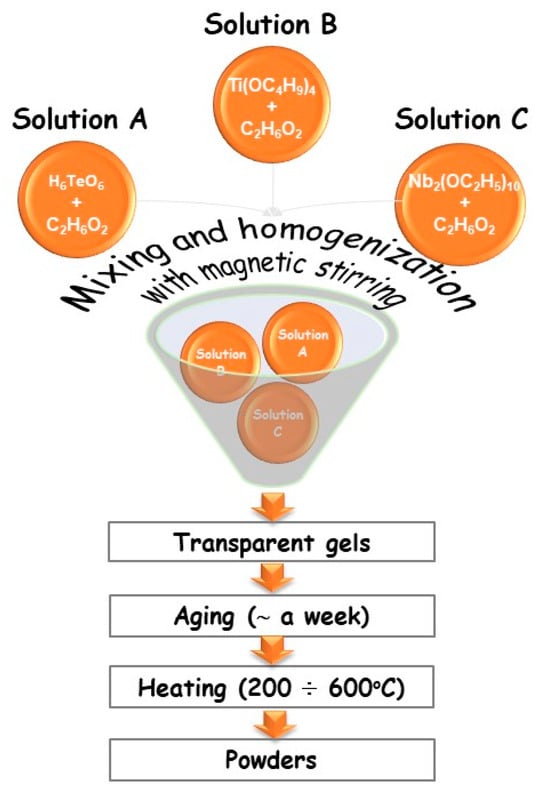 Based on our previous findings on gel formation in other ternary TiO2–TeO2–MnOm (B2O3, ZnO, SeO2) systems [19,20,21], compositions containing higher TiO2 content were selected—80TiO2/20Nb2O5, 80TiO2/10TeO2/10Nb2O5, and 50TiO2/25TeO2/25Nb2O5—denoted as samples A, B, and C, respectively. They were subjected to detailed investigations. The gels were prepared using a combination of Te(VI) acid (99.99%, Aldrich, St. Louis, MO, USA), along with Ti butoxide(IV) (≥99%, Fluka AG, Buchs, Switzerland) and niobium(V) ethoxide (C10H25NbO5) (Merck, Darmstadt, Germany) as precursors dissolved in ethylene glycol (C2H6O2) (99%, Aldrich) (Figure 1). Telluric acid (H6TeO6) was chosen to overcome the problem with the high hydrolysis rate of tellurium(VI) alkoxide, which has been analyzed in numerous papers [20,21]. The precursor solutions were subjected to 5–10 min of intensive stirring at room temperature to achieve complete dissolution. No direct addition of water was made to the precursor solutions. The sol-gel hydrolysis reaction was acquired from absorbed atmospheric moisture. The measured pH was 4–5, depending on composition. The gelation for the investigated compositions occurred immediately. To complete the hydrolysis, aging of the gels was performed in air for several days. The obtained gels were subjected to stepwise heating from 200 to 600 °C for one hour of exposure time in air. Aiming to verify the phase and structural transformations of the gels, heating in the range of 200–600 °C until powders were obtained was performed. The selection of the temperatures was made based on our previous investigations [20].