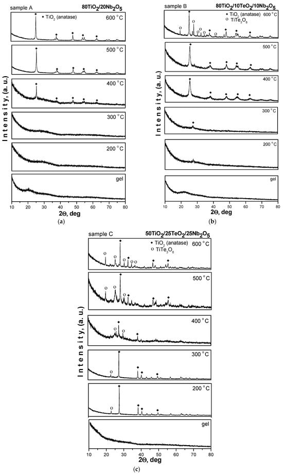 The crystallinity and phase formation of the investigated samples calcined at different temperatures (200–600 °C) were analyzed by XRD. The XRD patterns of the samples are shown in Figure 2. As seen in the figure, the samples containing 80 mol% TiO2 preserved the amorphous state up to 300 °C, while in the third sample (sample C, 50 mol% TiO2), first TiO2 (anatase, JCPDS 78-2486) along with TiTe3O8 (JCPDS 50-0250) crystals are already detected at 200 °C and are present up to 300 °C. The main peculiarity in the XRD pattern of sample C is that the amount of crystalline TiTe3O8 phase increased with increasing temperature. In the other two samples, A and B, the first anatase crystals appeared at 400 °C, and this remained the dominant phase up to 600 °C in both samples. Similar to the ternary sample C, the XRD pattern of sample B exhibited the presence of TiTe3O8 at 600 °C, but that phase appeared only at the highest temperature, while in sample C, the same phase coexisted with the TiO2 (anatase) in the temperature range of 400–600 °C. The average crystallite size of the TiO2 (anatase) particles, calculated from the broadening of the diffraction line using Sherrer’s equation, is in the range of 10–30 nm, as the XRD pattern of sample B at 400 °C exhibited a broader peak than the other samples. The obtained XRD data are very similar to those reported in other papers [25,26].