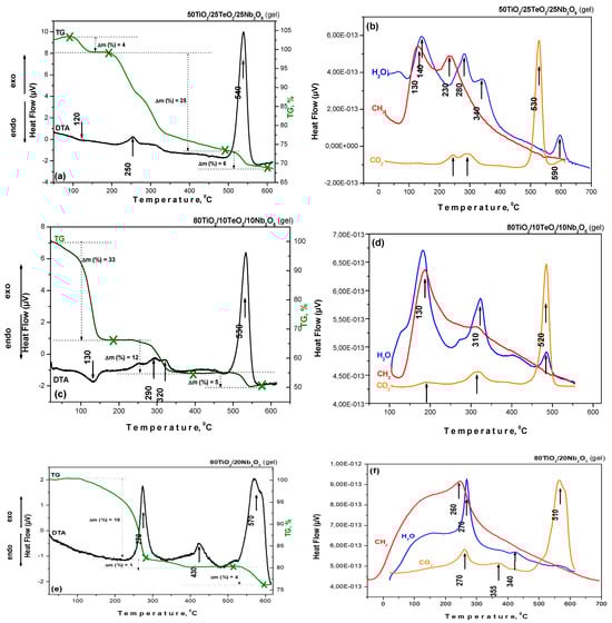 DTA/TG curves (a,c,e) and mass spectra (b,d,f) of the investigated compositions.