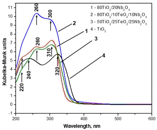 The optical absorption spectra of investigated gels were compared to those of TiO2 obtained by Ti(IV) butoxide gel (Figure 5). The absorption edge and optical band gap values of the samples are summarized in Table 1. All gels possess good absorption in the UV region, where the ternary sample 80TiO2/10TeO2/10Nb2O5 exhibited the highest absorption, while sample C—which had the lowest TiO2 content—showed a decrease in the absorption. This observation might be associated with interface charge transfer between TiO2 and Nb2O5 [37,38].