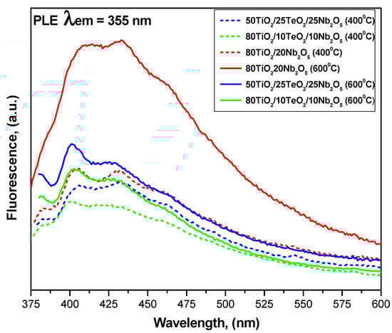Room-temperature emission PL spectra of the investigated samples heated at 400 and 600 °C are shown in Figure 6. Two obvious signals at 400 and 430 nm are observed, originating from the irradiative recombination of free electrons in shallow traps and sub-bands below the conductive band and free holes at the valance band edge [44,45,46]. The shape of the spectra is similar for all samples, indicating that the addition of different TeO2 and Nb2O5 amounts to TiO2 does not induce new emission phenomena. It is obvious that the samples heat-treated at a higher temperature (600 °C) exhibited stronger PL signals. As mentioned above, the intensity of the spectra results from both the recombination of electron–hole pairs (the lower the intensity, the lower the recombination) and the presence of lattice defects or oxygen vacancies (the higher the intensity, the greater their number) [47,48,49]. Generally, the intensities of the two PL signals are reduced in samples containing lower Nb2O5 amounts, except those in sample A, which did not contain TeO2. Perhaps its presence decreases the recombination rate of photogenerated electron–hole pairs. Therefore, the binary 80TiO2/20Nb2O5 is expected to exhibit promoted activity in photocatalytic tests. It is also noticed that samples containing 20 and 25 mol% Nb2O5 showed stronger signals at 400 nm, which is probably due to the presence of oxygen vacancies [50]. For all samples, the main emission band is around 400 nm, and according to Tam et al. [51], this can be attributed to the indirect band-to-band transition of electrons in TiO2. On the other hand, this short-wavelength PL could be ascribed to the near-band gap emission of Nb2O5 [1,50]. The other PL emission band (430 nm) could be ascribed to the structure defects [1,40].