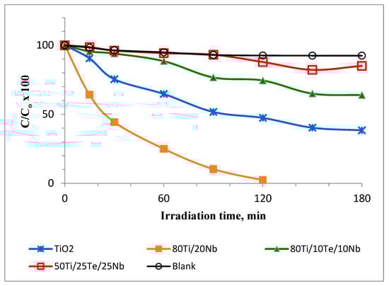 The photocatalytic activity of the as-synthesized TiO2 samples was tested by the degradation of MG under UV irradiation. Figure 6 presents the results of photocatalytic experiments with the investigated samples compared with those of pure TiO2 synthesized from Ti(IV) butoxide. As can be seen, the photocatalytic performance of the sample 80TiO2/20Nb2O5 was more efficient than the other assayed samples toward MG degradation (Figure 7). After 120 min of UV irradiation, the MG dye was completely decolorized by sample A (80TiO2/20Nb2O5), while for samples B, C, and pure TiO2, the percentages of residual MG were about 75%, 88%, and 50%, respectively. The BET measurements provide additional confirmation of the photocatalytic results of the species. The specific surface area (SSA) of the ternary samples is about 35–45 m2/g, while the binary one exhibited a value of 70 m2/g.