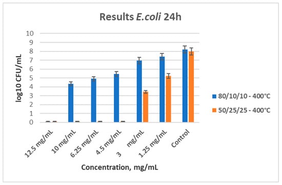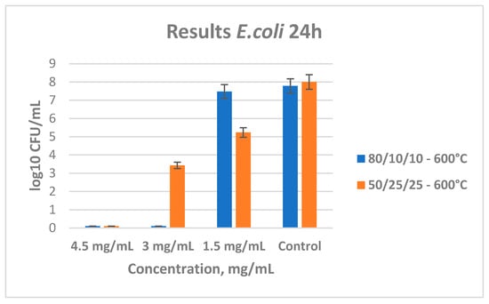 Antibacterial effect of both ternary samples heat-treated at 400 °C, with different concentrations influencing E. coli.
