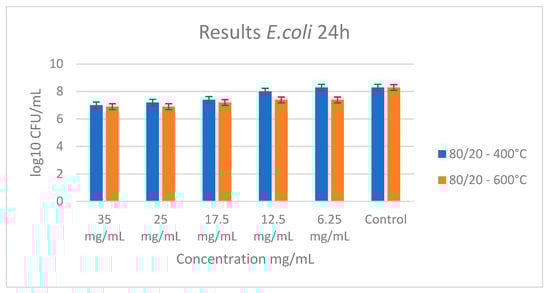 Antibacterial effect of sample A (80TiO2/20Nb2O5) heat-treated at 400 °C and 600 °C with different concentrations influencing E. coli.