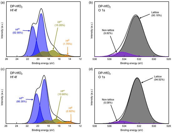 - Driemeier, C.; Wallace, R.M.; Baumvol, I.J.R. Oxygen species in HfO2 films: An in situ X-ray photoelectron spectroscopy study. J. Appl. Phys. 2007, 102, 024112. [Google Scholar] [CrossRef]