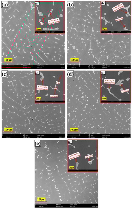 Microstructure of as-cast alloys ((a,a’) = 0%Yb; (b,b’) = 0.15% Yb; (c,c’) = 0.3% Yb; (d,d’) = 0.45% Yb; (e,e’) = 0.6% Yb, wt.%).