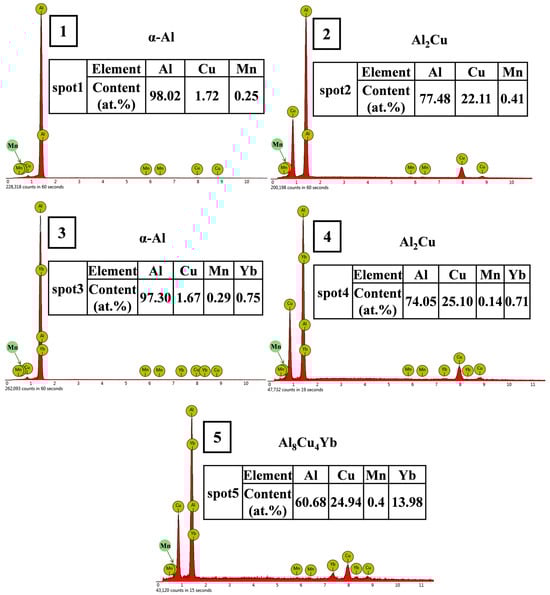 The microstructure of the as-cast alloy is shown in Figure 3, and the EDS microzone composition analysis of each phase is shown in Figure 4. The X-ray diffraction patterns of the alloy are shown in Figure 5. It can be seen from Figure 3 that the as-cast microstructure of the alloy consists of α-Al (spot 1, 3), θ-Al2Cu (spot 2, 4), and Al8Cu4Yb (spot 5) phases. The dark grey α-Al is the matrix phase with a dendritic crystal structure; the light white banded or reticulated phase mixed with the dark grey phase is the α-Al + θ-Al2Cu eutectic structure, which is distributed at the grain boundaries or interdendritic regions; and a small number of skeletal bright white Al8Cu4Yb phase attached to the eutectic structure. According to the Al-Cu binary equilibrium phase diagram, the Cu content between the maximum solid solubility (5.65%) and the Al-Cu eutectic point (33.2%) belongs to the sub-eutectic alloy.