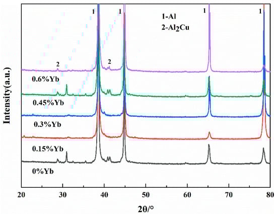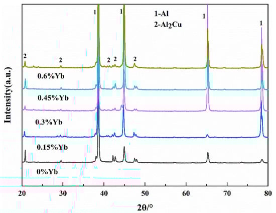 On the other hand, the enrichment of Yb at the solidification interface during the solidification process also leads to solute redistribution, resulting in the supercooling of the components of the solidification interface and ultimately speeding up the solidification of the residual liquid surrounding the α-Al grains, and indirectly refining the size of α-Al grains [32]. Due to the constitutional supercooling of the residual liquid around the primary α-Al grains, the size of α-Al + Al2Cu elongated reticular eutectic structure decreases with the Yb content increasing, which can be seen in Figure 3; 0.3 wt.% Yb alloy has the best effect on eutectic structure refinement. When the Yb content is 0.3 wt.%, the micrometer-sized Al8Cu4Yb begins to appear. The number of Al8Cu4Yb phases increases increasingly as the Yb content increases, while the size is coarser with the content Yb increasing. However, since the total number of Al8Cu4Yb phases is not large, the diffraction peak of this phase is not seen in the diffraction pattern of Figure 5, but based on the EDS analysis in Figure 4 and some references [26,33], we conclude that the phase is Al8Cu4Yb.