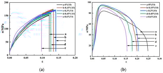 Figure 6a and Figure 6b show the tensile stress–strain curves of the as-cast alloy at room temperature and high temperature (350 °C), respectively, and the corresponding tensile mechanical properties are shown in Table 2 and Table 3.