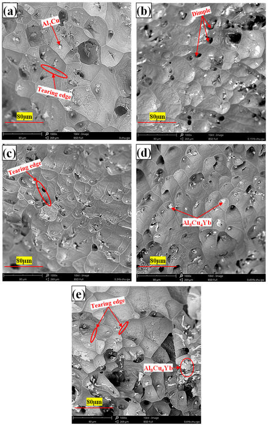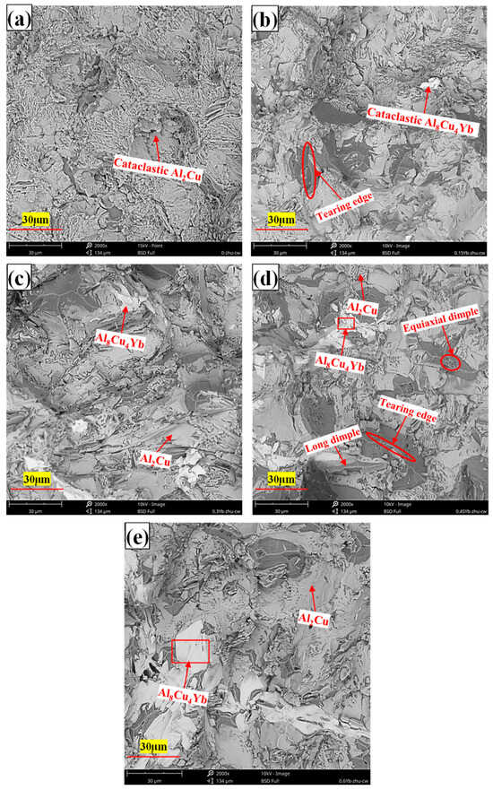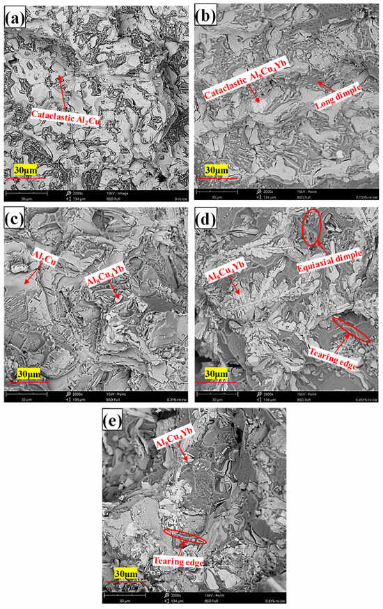 Tensile fracture morphology of T6 heat-treated alloy at room temperature ((a) = 0%Yb; (b) = 0.15%Yb; (c) = 0.3%Yb; (d) = 0.45%Yb; (e) = 0.6%Yb, wt.%).