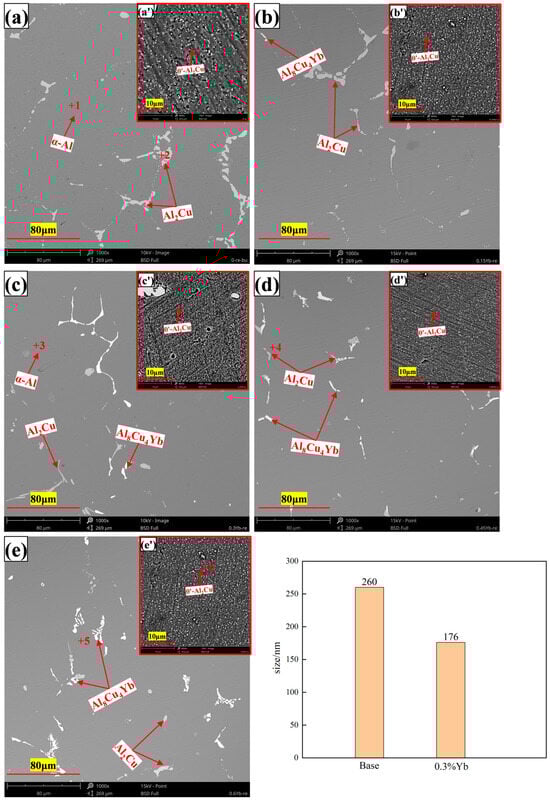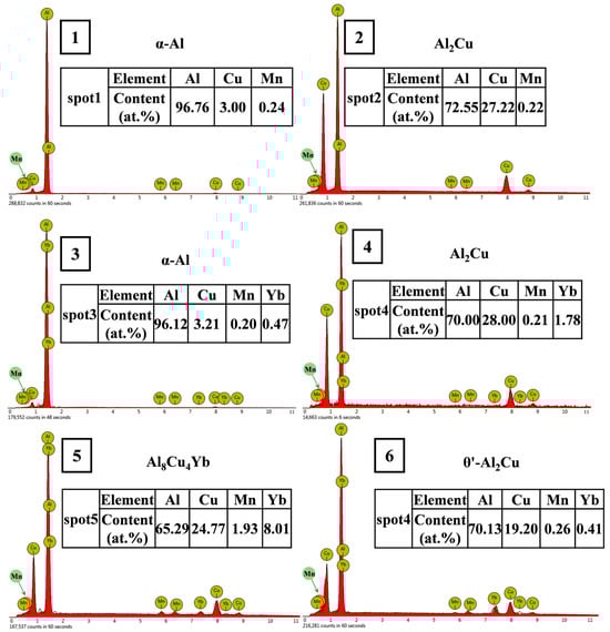 The microstructure photos of the heat-treated alloy are shown in Figure 9, the low-magnification times photos in Figure 9a–e, and the high-magnification times photos in Figure 9a’–e’. The microcomponent analysis of each point in Figure 9 is shown in the energy spectrum diagram in Figure 10. Figure 11 shows the X-ray diffraction pattern of the alloy. The phase composition of the heat-treated alloy has not changed and is still composed of α-Al (spot 1, 3), θ-Al2Cu (spot 2, 4), and Al8Cu4Yb (spot 5) phases. However, the microscopic morphology changed considerably. The low-magnification photographs show that after heat treatment, many reticulated α-Al + Al2Cu eutectic structures at the grain boundaries disappear, and the residual Al2Cu phases are clustered into spheres or strips. Due to the strong thermal diffusion during solid solution treatment at 540 °C, most of the coarse Al2Cu phase that initially existed in the cast state is dissolved into the aluminum matrix (the limit solid solubility of Cu in the aluminum matrix is 5.65 wt.%). In addition, to achieve thermodynamic stability, the residual Al2Cu phase appears spheroidized, and the average size of the spheroidized particles is 5 μm. After aging treatment at 170 °C, the θ′-Al2Cu phase (spot 6) precipitates from a supersaturated solid solution; the size of these precipitates decreases first and then increases, mainly when the amount of Yb is increased, the amount of precipitation also increases, the number of particles increases to a certain extent, andthe particle spacing decreases, the trend of particle consolidation and growth. Therefore, the microstructure characteristic of θ′-Al2Cu particles refined and then coarsened in Figure 9 is finally formed. The Al8Cu4Yb phase does not dissolve after T6 heat treatment, indicating that the phase has good thermal stability.