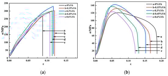 Figure 12 shows the tensile stress–strain curves at room temperature and high temperature (350 °C) after heat treatment of the alloy. Table 4 and Table 5 show the corresponding tensile mechanical properties. As can be seen from Table 4, the tensile strength and yield strength of the heat-treated alloy at room temperature are significantly improved compared with that of the as-cast alloy. The ultimate tensile strength of the heat-treated alloy at room temperature is 154.13 MPa higher than that of the as-cast alloy, an increase of 88%, indicating that the heat treatment plays a vital role in the mechanical properties of the alloy. The tensile strength of the heat-treated alloy at room temperature increases first and then decreases with the increase of Yb content. The ultimate tensile strength and yield strength of the alloy with Yb content of 0.3 wt.% are the highest, reaching 328.98 MPa and 272.86 MPa, respectively, which are 21.63% and 33.95% higher than that of the base alloy, respectively.