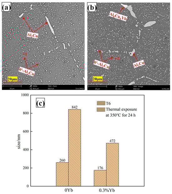 Microstructure and phase size changes of T6 heat-treated alloys after 24 h of heat exposure at 350 °C ((a) = 0%Yb; (b) = 0.3%Yb, wt.%; (c) dimensional changes of phases).