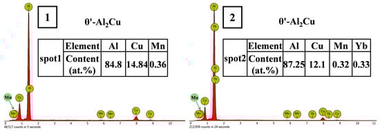For the same precipitated phase, the strength of the precipitation at room temperature is mainly determined by the number and size of the precipitated phase. The more precipitated phase, the smaller the size, and the more uniform the distribution, the more significant the strengthening effect. However, at high temperatures, the strength and thermal stability of the precipitated phase are also important factors affecting the strengthening effect. For this reason, 24 h heat exposure experiments were carried out on the heat-treated base alloy and the alloy with a Yb content of 0.3 wt.%. The microstructure is shown in Figure 15, and the analysis of the EDS points corresponding to points 1 and 2 in the figure is shown in Figure 16. It can be seen that the size of θ′-Al2Cu particles in both alloys increases after thermal exposure. Statistical analysis shows that the θ′-Al2Cu particle sizes of the matrix alloy and 0.3 wt.% Yb alloy coarsens by 224% and 168%, respectively, after 24 h of thermal exposure. The coarsening rate of θ′-Al2Cu particles in the base alloy without Yb is higher than that of the Yb-added alloy, which suggests that Yb also improves the thermal stability of the θ′-Al2Cu phase. This is also why adding Yb enhances the alloy’s high-temperature mechanical properties.