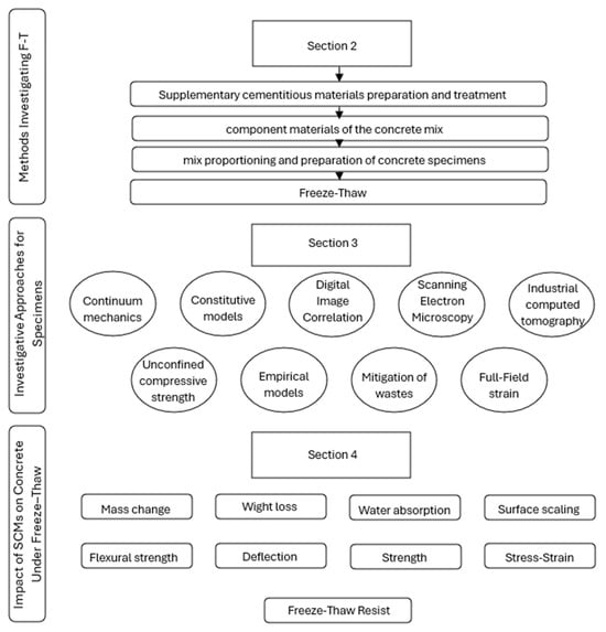 The present general review paper will look at the current information available on the effect of a wide range of SCMs on concrete resistance to freezing and thawing; the structure of the paper is shown in Figure 1. Also described in this paper are the mechanisms by which these different types of additives work, and the results of several research studies that have tested them. This paper will further discuss the factors that affect the performance of additives and some of the recommendations that have been provided for the use of additives in concrete mixes. Despite that, SCMs have an environmental effect, because the availability of industrial byproducts is slowly declining, for example, in the case of fly ash. This has, therefore, spurred investigations for more sustainable alternatives, whereby natural biomaterials and their byproducts look promising for reducing the environmental footprint of concrete. Such materials include rice husk ash, coconut shell powder, and bamboo ash as possible SCM replacements because of the pozzolanic properties they contain and their abundance as an agricultural waste. These natural materials will not only help to reduce waste but will also be capable of improving the concrete strength and durability.