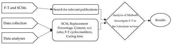 This review was conducted using a literature search focusing on the F-T durability of concrete incorporating different additives. The research strategy involved querying major scientific databases, to identify the most relevant peer-reviewed articles. In Figure 2, the method used to ensure comprehensive coverage is shown: