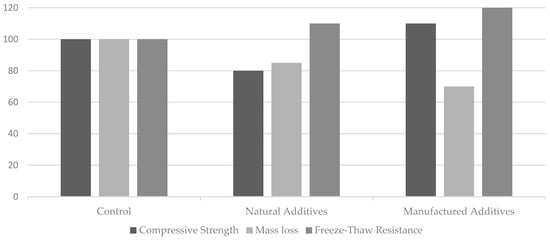 If we make a comparison between all of these additives and divide them into two groups, manufactured additives and natural additives (see Table 2), we will notice that the manufactured additives generally have a better impact on the concrete resistance to freeze–thaw cycles compared to the natural additives. While both types of additives enhance the freeze–thaw durability, manufactured additives, like nano-SiO2/nano-TiO2, graphene oxide, silica fume, latex, etc., are particularly noted for their superior performance in improving concrete’s durability against freeze–thaw cycles. These additives tend to offer higher resistance, reduced mass loss, and less internal damage during the freeze–thaw process compared to natural additives. The graph below illustrates the comparative performance of the following three different concrete mix types: control (no additives), natural additives, and manufactured additives (see Figure 3). The performance was assessed across the following three key aspects: the compressive strength, mass loss, and freeze–thaw resistance. The control mix served as the baseline for comparison. Natural additives, which include materials such as zeolite and fly ash, etc., generally improved the durability by reducing the mass loss and enhancing the freeze–thaw resistance (see Table 3), though they may slightly reduce the compressive strength. All of these data were gathered from the literature.