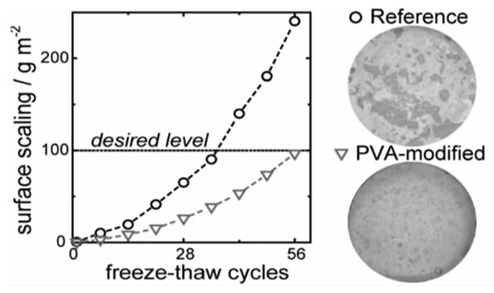 Additives to the material, such as graphene oxide (GO) and Polyvinyl Alcohol (PVA), have been demonstrated to improve the freeze–thaw resistance. Samples with GO exhibited less weight loss and lower damage compared to the control mixes, whereas the concretes modulated with PVA significantly reduced the surface scaling (see Figure 4). These observations may indicate that such additives can be effectively used for the mitigation of the adverse effects of freeze–thaw cycles.