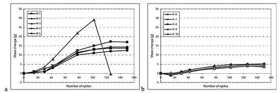 Mass change in concrete: (a) non-air-entrained GGBS specimens; (b) air-entrained GGBS specimens [18].