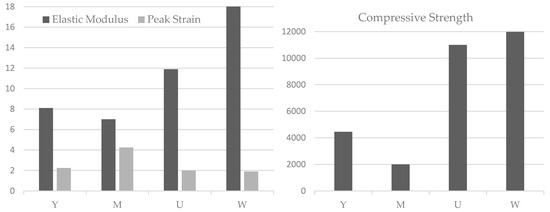 EPS concrete compression performance after 250 F-T cycles, where Y, M, U, W are different groups of relative dynamic elastic modulus attenuation [36].
