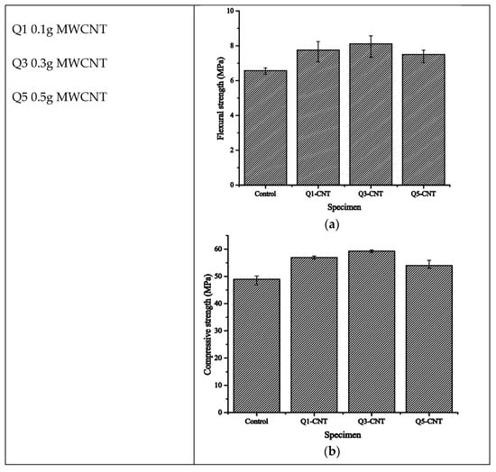 Flexural (a) and compressive strengths (b) of the MWCNT specimens after 28d of standard curing [29].