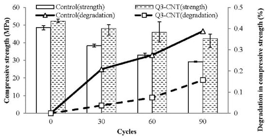 Degradation in compressive strength of the control and Q3-CNT specimens under freeze-thaw (FT) cycles [29].