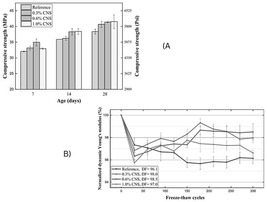 CNT specimen in (A) the compressive test result; (B) the development of the normalized dynamic Young’s modulus under F-T cycles [35].