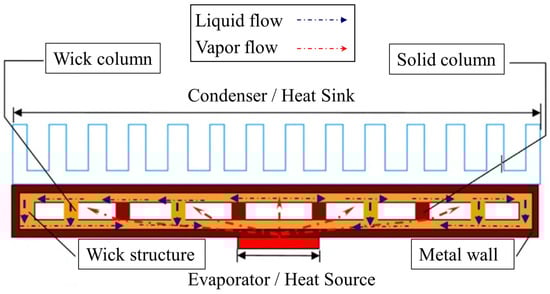 To evaluate the performance enhancement provided by the capillary structure, an additional VC of identical dimensions but without a capillary structure was fabricated. This control VC was filled with the same quantity of methanol as a 100%-filled VC with a capillary structure. This comparison allowed for isolating the effect of the capillary structure on thermal performance.