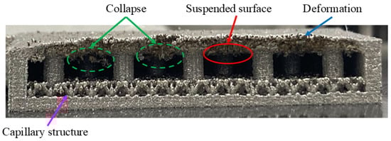 During horizontal printing, excessive unsupported surfaces (suspended surface) may form within the component, especially when the support structures are insufficient. These unsupported surfaces are prone to collapse during printing, leading to print failures. Even if printing is completed, the component surface may exhibit significant defects caused by gravitational effects and uneven stress distribution, such as edge warping, structural deformation, collapse, or localized damage (as shown in Figure 3). These defects not only affect the appearance of the VC but also severely compromise its functionality and reliability, further reducing its thermal performance and durability.