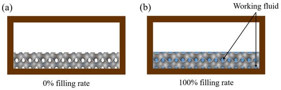 The working fluid used in the experiment was methanol. During the preparation phase, a vacuum pump was employed to evacuate the chamber to below Torr, ensuring that any residual air was removed. Once the desired vacuum level was achieved, a precise quantity of methanol was injected into the system to establish the targeted fill ratio. A 100% fill ratio is defined as the condition where the capillary structure within the evaporator is completely saturated with the working fluid, as illustrated in Figure 7.