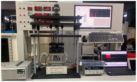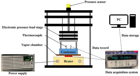 An electronic pressure loading platform was utilized to apply a fixed pressure of 20 kgf, ensuring consistent and stable contact between the VC, the heater, and the condenser throughout the testing process. To maintain temperature uniformity at the condenser, the cooling plate’s water flow rate was set at 20 LPM, and the water temperature was precisely controlled at 28 °C. These conditions ensured uniform cooling and consistent experimental settings for all tests, minimizing potential variances.